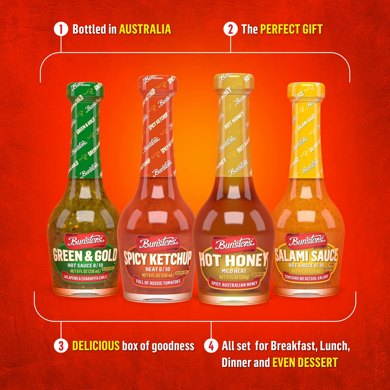Bunsters Fresh Ones Hot Sauce Gift Pack - feat. Hot Honey, Green & Gold, Salami Sauce and Spicy Ketchup. The Ultimate Bunsters Hot Sauce Experience