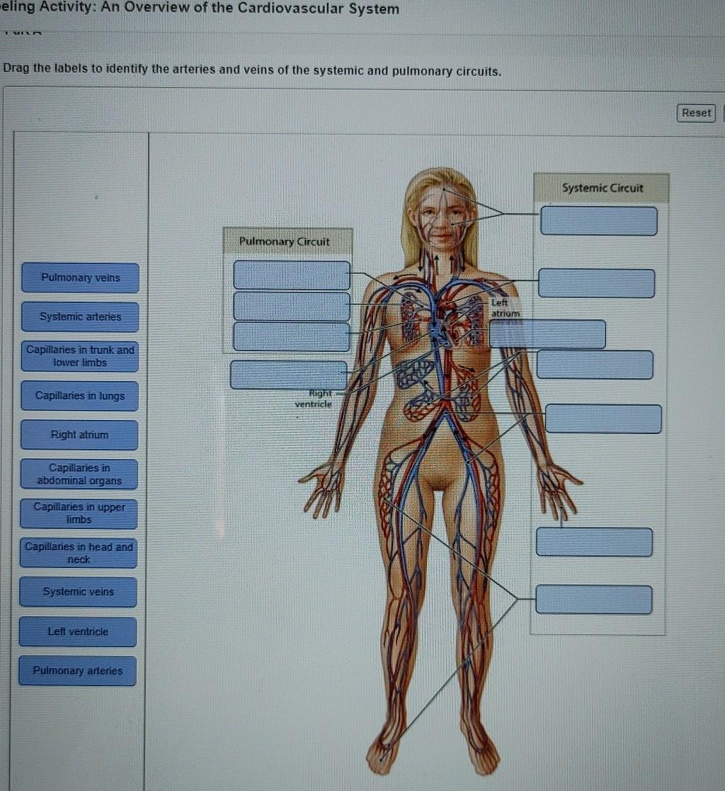 lab 3, exercise 3 Flashcards | Quizlet Drag the labels to identify the arteries and veins of the systemic and pulmonary circuits. 1. pulmonary arteries 2. capillaries in lungs 3. pulmonary veins 4. right atrium 5. capillaries in head and neck 6. systemic arteries 7. left ventricle 8. capillaries in abdominal organs 9. systemic veins 10. capillaries in upper limbs