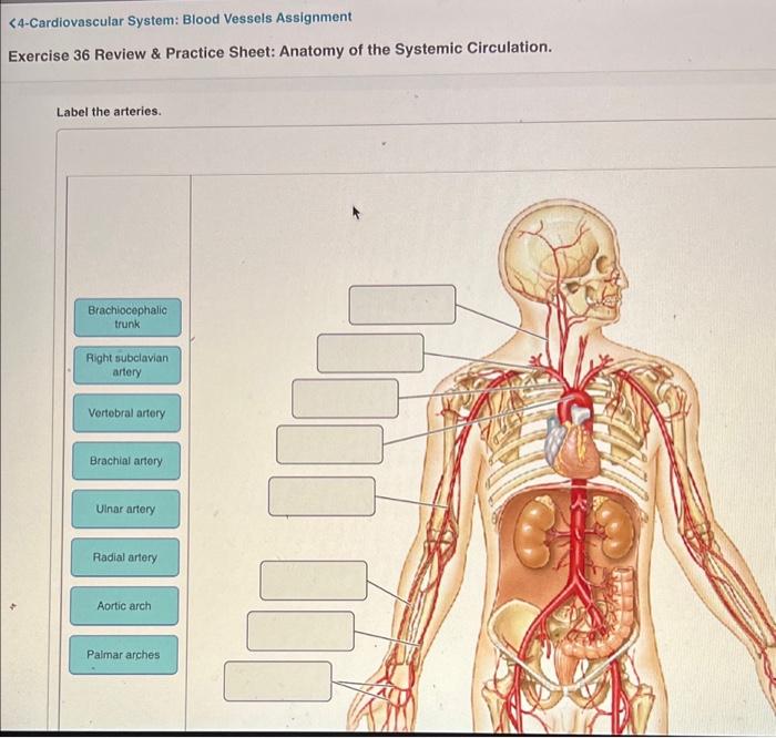 The circulatory system review (article) | Khan Academy The main artery of the systemic circuit is the aorta which branches out into other arteries, carrying blood to different parts of the body. Common mistakes and misconceptions Arteries usually carry oxygenated blood and veins usually carry deoxygenated blood. This is true most of the time. lab 3, exercise 3 Flashcards | Quizlet Drag the labels to identify the arteries and veins of the systemic and pulmonary circuits. 1. pulmonary arteries 2. capillaries in lungs 3. pulmonary veins 4. right atrium 5. capillaries in head and neck 6. systemic arteries 7. left ventricle 8. capillaries in abdominal organs 9. systemic veins 10. capillaries in upper limbs Arteries of the Body: Picture, Anatomy, Definition & More - Healthline Arteries of the lungs, heart, pelvis, and the aorta in the abdomen The torso arteries include: Bronchial. There are typically two bronchial arteries, one on the left and one on the right....