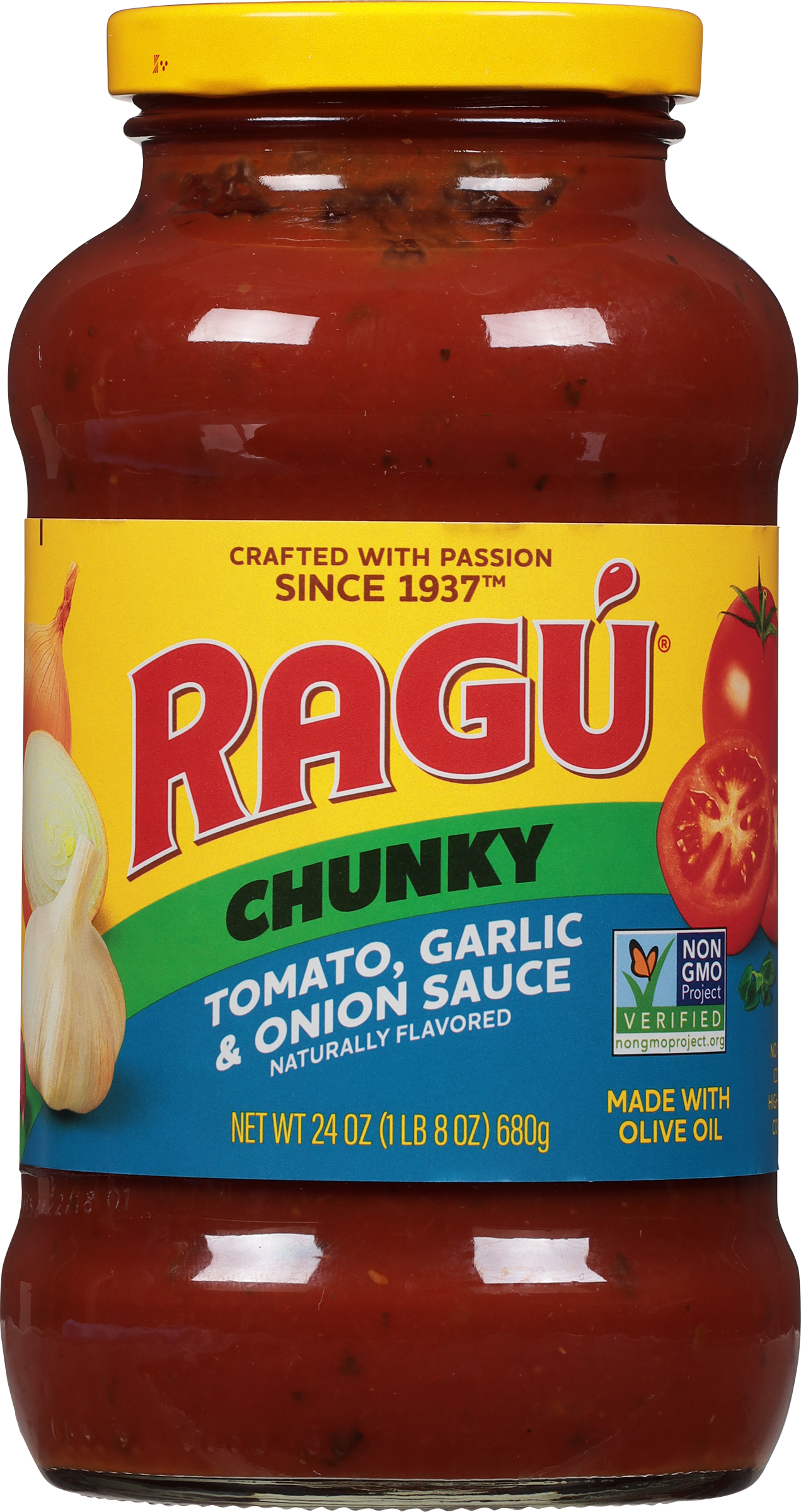 Simply Traditional Pasta Sauce | RAGÚ® Made with olive oil Has no sugar added Simply delicious flavor Available in 24oz jars *Not a low calorie food. See Nutrition Information for sugar, sodium & calories. Tomato Puree (Water, Tomato Paste), Olive Oil, Salt, Onions, Carrots, Dehydrated Onions, Garlic Powder, Onion Powder, Spices. Shop Now Nutritional Information
