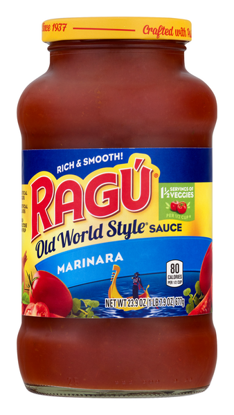 Old World Style® Traditional Spaghetti Sauce | RAGÚ® Smooth, flavorful spaghetti sauce Contains two servings of vegetables in every 1/2 cup of sauce Available in 14oz, 24 oz, 45oz and 66oz jars Tomato Puree (Water, Tomato Paste), Salt, Olive Oil, Sugar, Dehydrated Onions, Dehydrated Garlic, Spices, Garlic Powder, Onion Powder. Shop Now Enter your zip code Search Nutritional